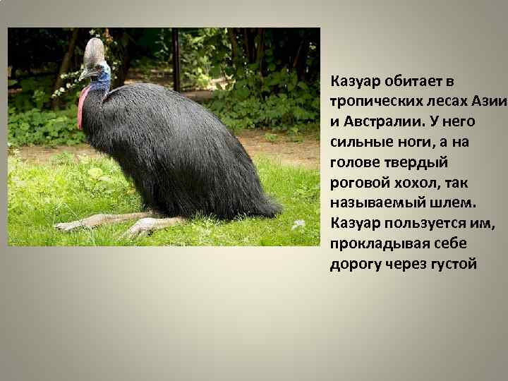 Казуар обитает в тропических лесах Азии и Австралии. У него сильные ноги, а на голове твердый роговой хохол, так называемый шлем. Казуар пользуется им, прокладывая себе дорогу через густой
