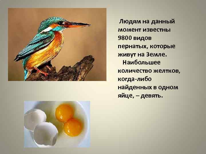 Людям на данный момент известны 9800 видов пернатых, которые живут на Земле. Наибольшее количество желтков, когда-либо найденных в одном яйце, – девять.
