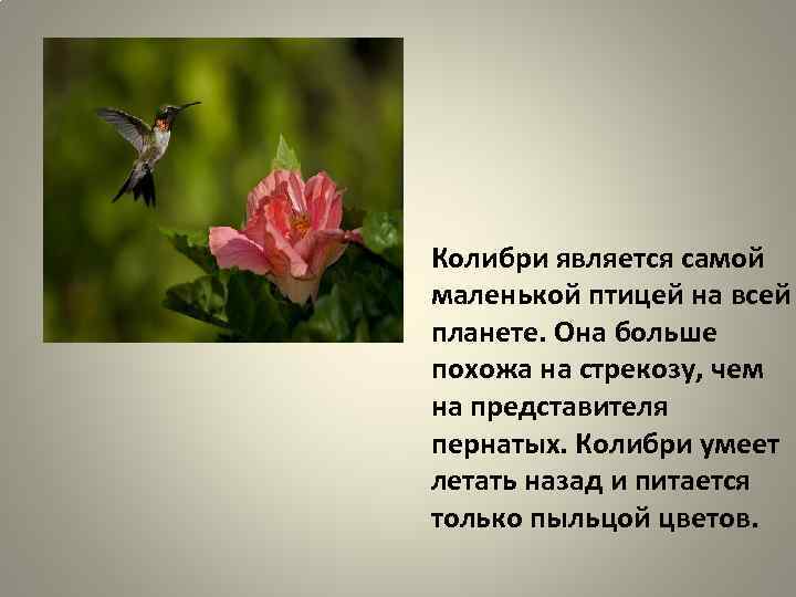 Колибри является самой маленькой птицей на всей планете. Она больше похожа на стрекозу, чем на представителя пернатых. Колибри умеет летать назад и питается только пыльцой цветов.