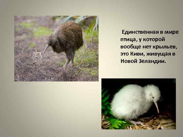 Единственная в мире птица, у которой вообще нет крыльев, это Киви, живущая в Новой Зеландии.