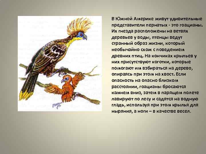 В Южной Америке живут удивительные представители пернатых - это гоацианы. Их гнезда расположены на ветвях деревьев у воды, птенцы ведут странный образ жизни, который необычайно схож с поведением древних птиц. На кончиках крыльев у них присутствуют коготки, которые помогают им взбираться на дерево, опираясь при этом на хвост. Если опасность на опасно близком расстоянии, гоацианы бросаются камнем вниз, затем в парящем полете лавируют по лесу и садятся на водную гладь, используя при этом крылья для ныряния, а ноги – в качестве весел.