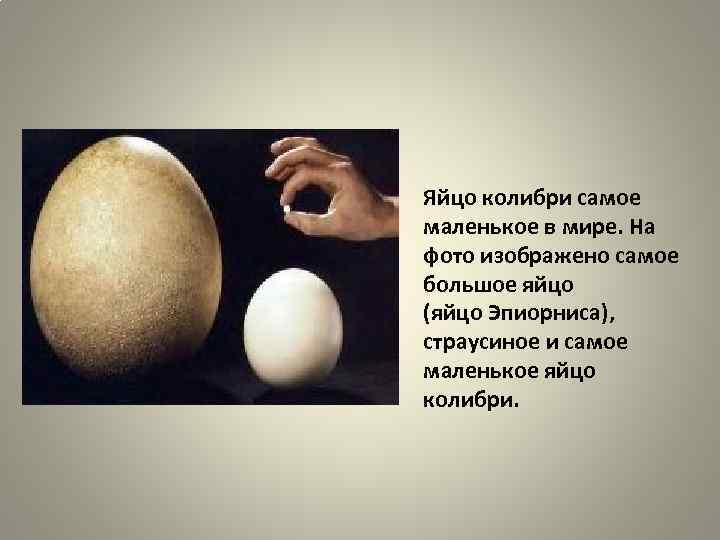Яйцо колибри самое маленькое в мире. На фото изображено самое большое яйцо (яйцо Эпиорниса), страусиное и самое маленькое яйцо колибри.
