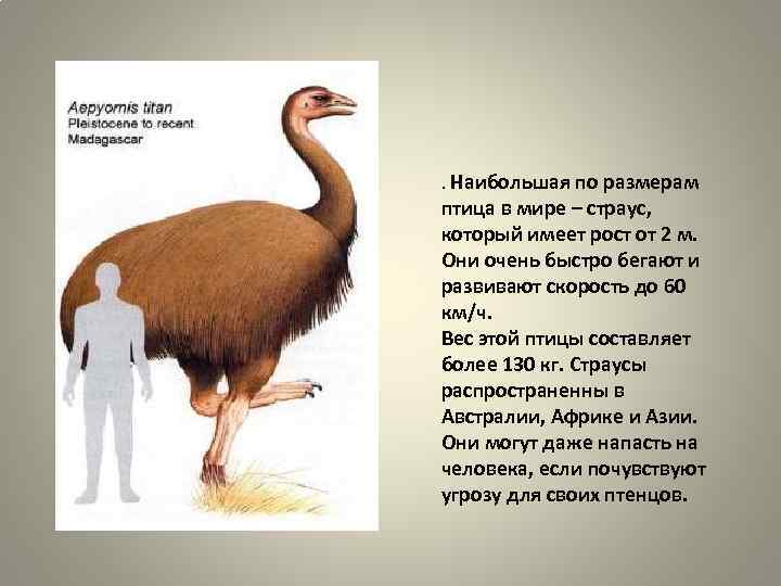 . Наибольшая по размерам птица в мире – страус, который имеет рост от 2 м. Они очень быстро бегают и развивают скорость до 60 км/ч. Вес этой птицы составляет более 130 кг. Страусы распространенны в Австралии, Африке и Азии. Они могут даже напасть на человека, если почувствуют угрозу для своих птенцов.