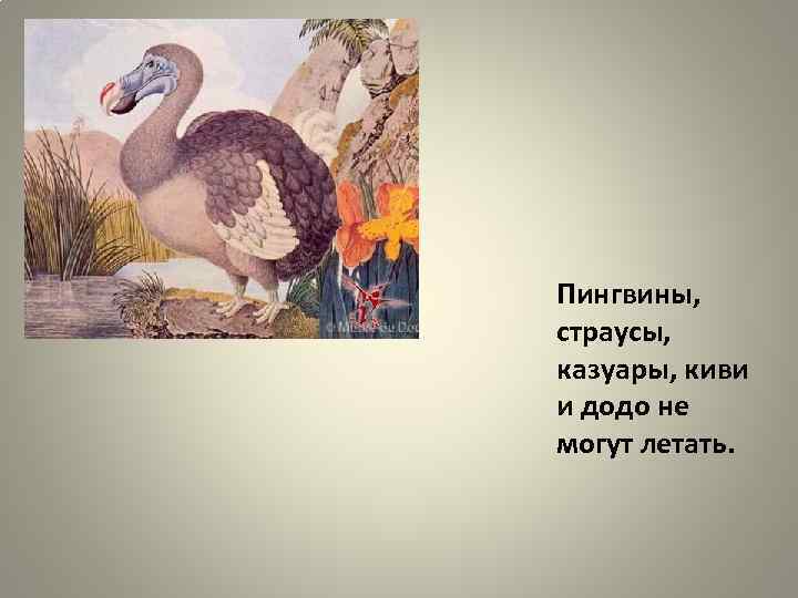 Пингвины, страусы, казуары, киви и додо не могут летать.