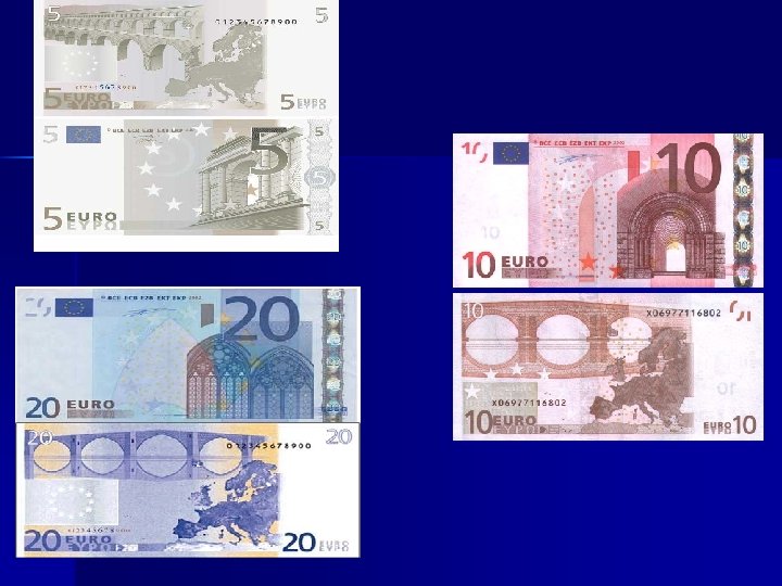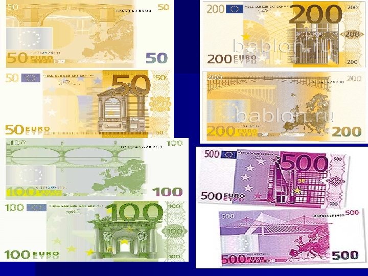 Немного о евро Выпускаются с 2002 года Европейским центральным банком (ЕЦБ). На каждой банкноте присутствует подпись президента ЕЦБ Жан-Клода Трише. Банкноты имеют единый дизайн. В настоящий момент в обращении находятся банкноты 7 номиналов. Каждая банкнота имеет свой размер и цвет. На банкнотах изображены примеры европейской архитектуры различных стилей и периодов истории. На передней стороне банкнот изображены окна и ворота, на задней — мосты. Изображения являются схематическими иллюстрациями, а не изображениями существующих строений. На каждой банкноте присутствует флаг Евросоюза, аббревиатура «ЕЦБ» на пяти языках (BCE, ECB, EZB, EKT, EKP), карта Европы, название валюты «евро» в латинской и греческой ( «ΕΥΡΩ» ) транскрипции, подпись текущего президента ЕЦБ. Дополнительно изображены 12 звёзд флага Евросоюза. Дизайн банкнот был разработан Робертом Калина и выбран среди 44 конкурсных работ 3 декабря 1996 года консилиумом Европейского Монетарного Института. Банкноты Евро печатаются на бумаге из хлопчатобумажного волокна, что продлевает срок службы и затрудняет подделку.