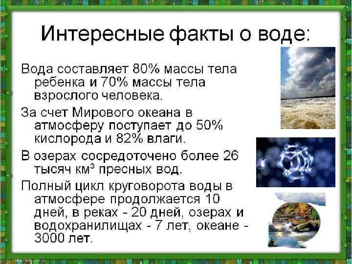 Факт шестой: основа жизни – это вода Вода – основа жизни. Все живые животные и растительные существа состоят из воды: животные – на 75%, рыбы – на 75%, медузы – на 99%, картофель - на 76%, яблоки - на 85%, помидоры - на 90%, огурцы - на 95%, арбузы - на 96%. Даже человек состоит из воды. 86% воды содержится в теле у новорожденного и до 50% у пожилых людей.