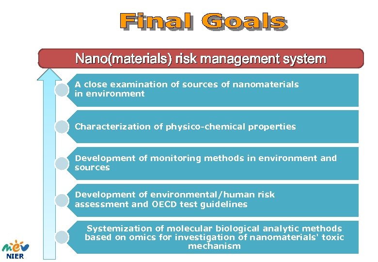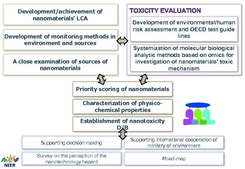 Nano(materials) risk management system A close examination of sources of nanomaterials in environment Characterization of physico-chemical properties Development of monitoring methods in environment and sources Development of environmental/human risk assessment and OECD test guidelines Systemization of molecular biological analytic methods based on omics for investigation of nanomaterials' toxic mechanism NIER