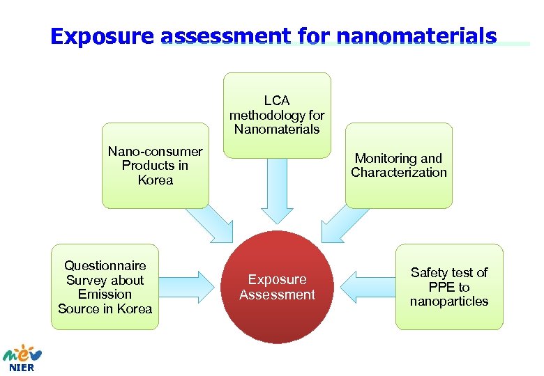 Exposure assessment for nanomaterials LCA methodology for Nanomaterials Nano-consumer Products in Korea Questionnaire Survey about Emission Source in Korea NIER Monitoring and Characterization Exposure Assessment Safety test of PPE to nanoparticles