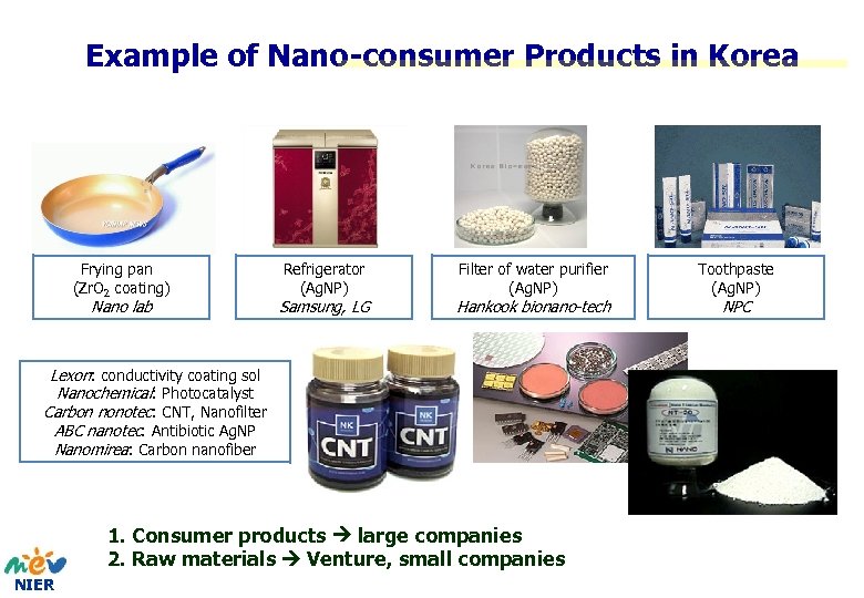 Example of Nano-consumer Products in Korea Frying pan (Zr. O 2 coating) Nano lab Refrigerator (Ag. NP) Samsung, LG Filter of water purifier (Ag. NP) Hankook bionano-tech Lexon: conductivity coating sol Nanochemical: Photocatalyst Carbon nonotec: CNT, Nanofilter ABC nanotec: Antibiotic Ag. NP Nanomirea: Carbon nanofiber 1. Consumer products large companies 2. Raw materials Venture, small companies NIER Toothpaste (Ag. NP) NPC