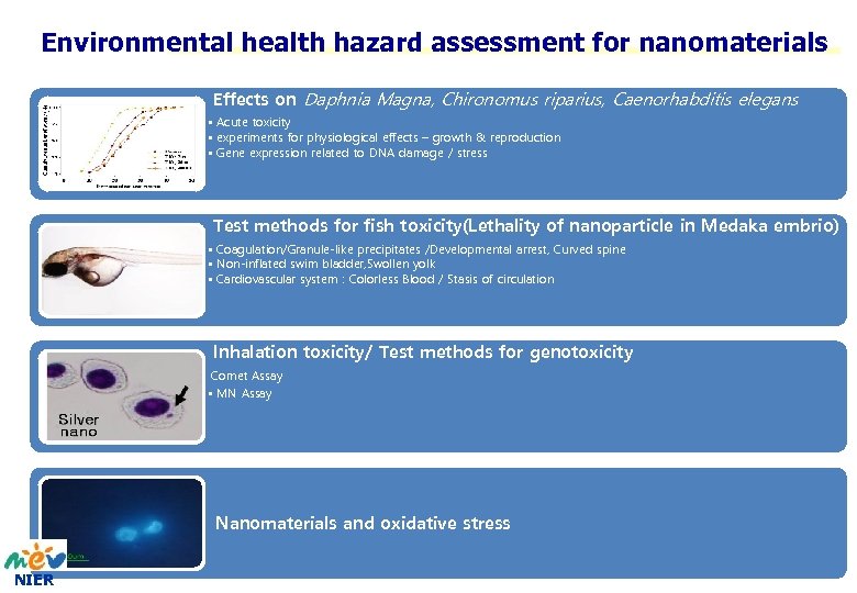 Environmental health hazard assessment for nanomaterials Effects on Daphnia Magna, Chironomus riparius, Caenorhabditis elegans • Acute toxicity • experiments for physiological effects – growth & reproduction • Gene expression related to DNA damage / stress Test methods for fish toxicity(Lethality of nanoparticle in Medaka embrio) • Coagulation/Granule-like precipitates /Developmental arrest, Curved spine • Non-inflated swim bladder, Swollen yolk • Cardiovascular system : Colorless Blood / Stasis of circulation Inhalation toxicity/ Test methods for genotoxicity Comet Assay • MN Assay Nanomaterials and oxidative stress NIER
