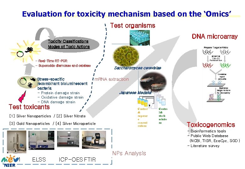 Evaluation for toxicity mechanism based on the ‘Omics’ Test organisms DNA microarray Toxicity Classifications Modes of Toxic Actions - Real-Time RT-PCR - Superoxide dismutase and catalase Stress-specific recombinant bioluminescent bacteria - Protein damage strain - Oxidative damage strain - DNA damage strain Saccharomyces cerevisiae m. RNA extraction Test toxicants [1] Silver Nanoparticles / [2] Silver Nitrate [3] Gold Nanoparticles / [4] Silver Microparticle Japanese Medaka Control & exposur e concent rations Contro l& stock solutio ns Toxicogenomics - Bioinformatics tools - Public Web Database (NCBI, TIGR, Eco. Cyc, SGD ) - Literature survey NPs Analysis TEM NIER ELSS ICP-OES FTIR