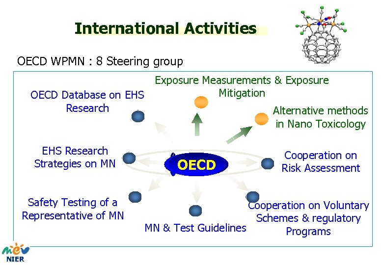 International Activities OECD WPMN : 8 Steering group Exposure Measurements & Exposure Mitigation OECD Database on EHS Research Alternative methods in Nano Toxicology EHS Research Strategies on MN Safety Testing of a Representative of MN NIER OECD Cooperation on Risk Assessment Cooperation on Voluntary Schemes & regulatory MN & Test Guidelines Programs