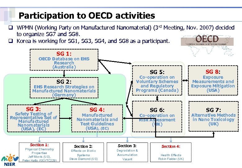 Participation to OECD activities q WPMN (Working Party on Manufactured Nanomaterial) (3 rd Meeting, Nov. 2007) decided to organize SG 7 and SG 8. q Korea is working for SG 1, SG 3, SG 4, and SG 8 as a participant. SG 1: OECD Database on EHS Research (Australia) SG 5: Co-operation on Voluntary Schemes and Regulatory Programs (Canada) SG 2: EHS Research Strategies on Manufactured Nanomaterials (Germany) SG 3: Safety Testing of Representative Set of Manufactured Nanomaterials (USA), (EC) Section 1: NIER Physical Chemistry Properties Jeff Morris (US), Peter Hatto (ISO/TC 229) SG 4: Manufactured Nanomaterials and Test Guidelines (USA), (EC) SG 6: Co-operation on Risk Assessment (UK) Section 2: Section 3: Section 4: Effects on Biotic Systems Steve Diamond (US) Degradation & Accumulation Vacant Health Effects Robin Fielder (UK) SG 8: Exposure Measurements and Exposure Mitigation (USA) SG 7: Alternative Methods in Nano Toxicology (UK)