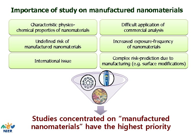 Importance of study on manufactured nanomaterials Characteristic physicochemical properties of nanomaterials Undefined risk of manufactured nanomaterials Increased exposure-frequency of nanomaterials International issue NIER Difficult application of commercial analysis Complex risk-prediction due to manufacturing (e. g. surface modifications) Studies concentrated on “manufactured nanomaterials” have the highest priority