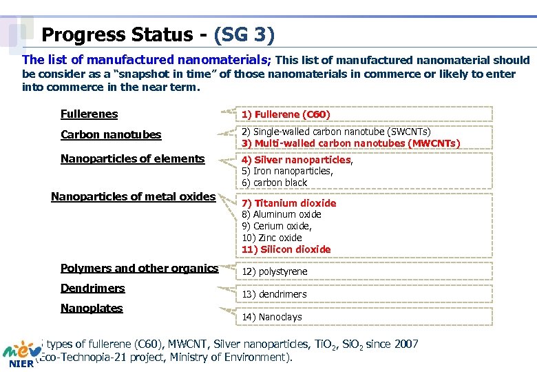 Progress Status - (SG 3) The list of manufactured nanomaterials; This list of manufactured nanomaterial should be consider as a “snapshot in time” of those nanomaterials in commerce or likely to enter into commerce in the near term. Fullerenes 1) Fullerene (C 60) Carbon nanotubes 2) Single-walled carbon nanotube (SWCNTs) 3) Multi-walled carbon nanotubes (MWCNTs) Nanoparticles of elements 4) Silver nanoparticles, 5) Iron nanoparticles, 6) carbon black Nanoparticles of metal oxides Polymers and other organics Dendrimers Nanoplates 7) Titanium dioxide 8) Aluminum oxide 9) Cerium oxide, 10) Zinc oxide 11) Silicon dioxide 12) polystyrene 13) dendrimers 14) Nanoclays q 5 types of fullerene (C 60), MWCNT, Silver nanoparticles, Ti. O 2, Si. O 2 since 2007 (Eco-Technopia-21 project, Ministry of Environment). NIER