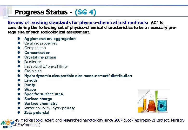 Progress Status - (SG 4) Review of existing standards for physico-chemical test methods: SG 4 is considering the following set of physico-chemical characteristics to be a necessary prerequisite of such toxicological assessment. l l l l l Agglomeration/ aggregation Catalytic properties Composition Concentration Crystalline phase Dustiness Fat solubility/ oleophilicity Grain size Hydrodynamic size/particle size measurement/ distribution Length Purity Shape Specific surface area Surface charge Surface chemistry Water solubility/ hydrophilicity Zeta potential q Key metrics (bold letter) and researched nanotoxicity since 2007 (Eco-Technopia-21 project, Ministry of Environment) NIER