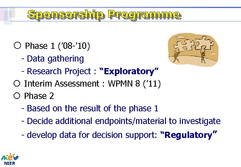 ¡ Phase 1 (’ 08 -’ 10) - Data gathering - Research Project : “Exploratory” ¡ Interim Assessment : WPMN 8 (’ 11) ¡ Phase 2 - Based on the result of the phase 1 - Decide additional endpoints/material to investigate - develop data for decision support: “Regulatory” NIER