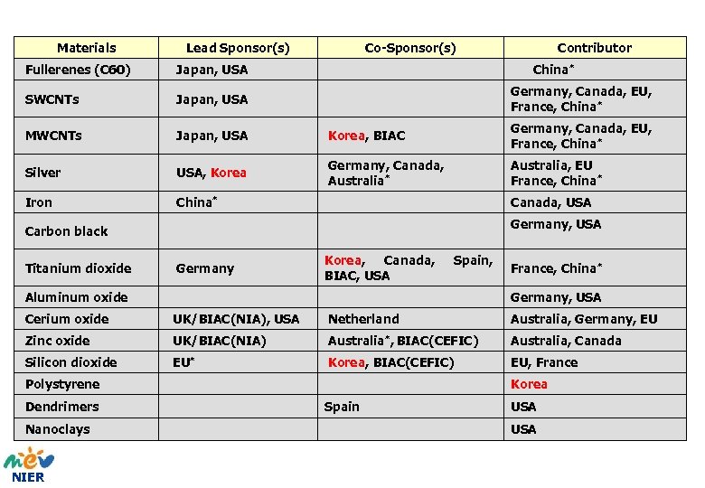 Materials Lead Sponsor(s) Co-Sponsor(s) Contributor Fullerenes (C 60) Japan, USA China* SWCNTs Japan, USA Germany, Canada, EU, France, China* MWCNTs Japan, USA Korea, BIAC Germany, Canada, EU, France, China* Silver USA, Korea Germany, Canada, Australia* Australia, EU France, China* Iron China* Canada, USA Carbon black Titanium dioxide Germany Korea, Canada, BIAC, USA Aluminum oxide Germany, USA Cerium oxide UK/BIAC(NIA), USA Netherland Australia, Germany, EU Zinc oxide UK/BIAC(NIA) Australia*, BIAC(CEFIC) Australia, Canada Silicon dioxide EU* Korea, BIAC(CEFIC) EU, France Polystyrene Korea Spain USA Dendrimers Nanoclays NIER Germany, USA Spain, France, China*