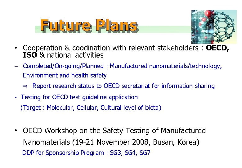 • Cooperation & coodination with relevant stakeholders : OECD, ISO & national activities – Completed/On-going/Planned : Manufactured nanomaterials/technology, Environment and health safety ⇒ Report research status to OECD secretariat for information sharing - Testing for OECD test guideline application (Target : Molecular, Cellular, Cultural level of biota) • OECD Workshop on the Safety Testing of Manufactured Nanomaterials (19 -21 November 2008, Busan, Korea) DDP for Sponsorship Program : SG 3, SG 4, SG 7