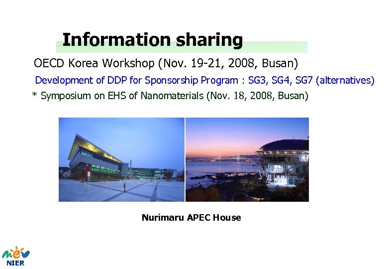 Information sharing OECD Korea Workshop (Nov. 19 -21, 2008, Busan) Development of DDP for Sponsorship Program : SG 3, SG 4, SG 7 (alternatives) * Symposium on EHS of Nanomaterials (Nov. 18, 2008, Busan) Nurimaru APEC House NIER