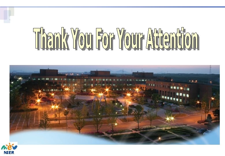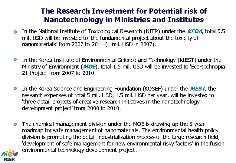 The Research Investment for Potential risk of Nanotechnology in Ministries and Institutes • In the National Institute of Toxicological Research (NITR) under the KFDA, total 5. 5 mil. USD will be invested to ‘the fundamental project about the toxicity of nanomaterials’ from 2007 to 2011 (1 mil. USD in 2007). • In the Korea Institute of Environmental Science and Technology (KIEST) under the Ministry of Environment (MOE), total 1. 5 mil. USD will be invested to ‘Eco-technopia 21 Project’ from 2007 to 2010. • In the Korea Science and Engineering Foundation (KOSEF) under the MEST, the research expenses of total 5 mil. USD, 1. 5 mil. USD per year, will be invested to ‘three detail projects of creative research initiatives in the nanotechnology development project’ from 2008 to 2010. • The chemical management division under the MOE is drawing up the 5 -year roadmap for safe management of nanomaterials. The environmental health policy division is promoting the detail industrialization process of the large research field, ‘development of safe management for new environmental risky factors’ in the fusion environmental technology development project. NIER