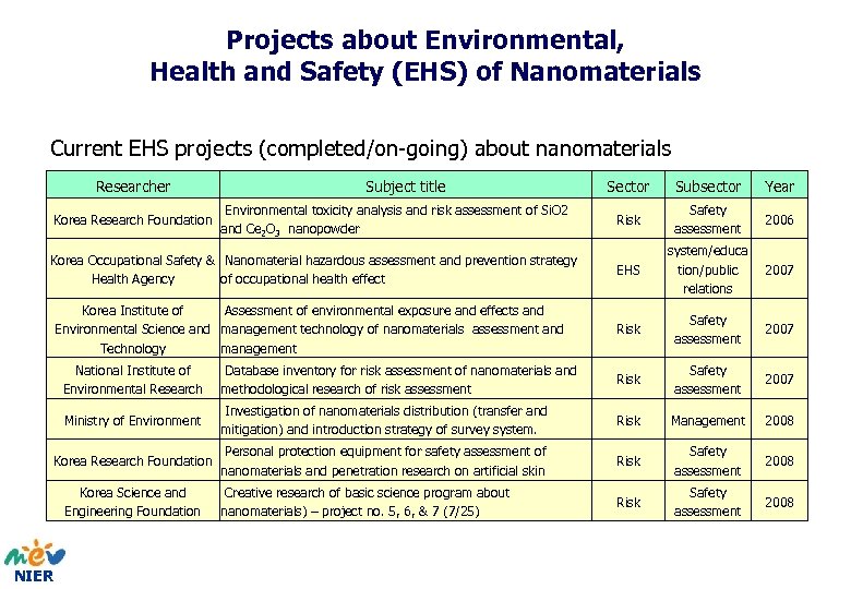 Projects about Environmental, Health and Safety (EHS) of Nanomaterials Current EHS projects (completed/on-going) about nanomaterials Researcher Korea Research Foundation Subject title Environmental toxicity analysis and risk assessment of Si. O 2 and Ce 2 O 3 nanopowder Korea Occupational Safety & Nanomaterial hazardous assessment and prevention strategy Health Agency of occupational health effect Korea Institute of Assessment of environmental exposure and effects and Environmental Science and management technology of nanomaterials assessment and Technology management Sector Subsector Year Risk Safety assessment 2006 EHS system/educa tion/public relations 2007 Risk Safety assessment 2007 National Institute of Environmental Research Database inventory for risk assessment of nanomaterials and methodological research of risk assessment Risk Safety assessment 2007 Ministry of Environment Investigation of nanomaterials distribution (transfer and mitigation) and introduction strategy of survey system. Risk Management 2008 Korea Research Foundation Personal protection equipment for safety assessment of nanomaterials and penetration research on artificial skin Risk Safety assessment 2008 Creative research of basic science program about nanomaterials) – project no. 5, 6, & 7 (7/25) Risk Safety assessment 2008 Korea Science and Engineering Foundation NIER