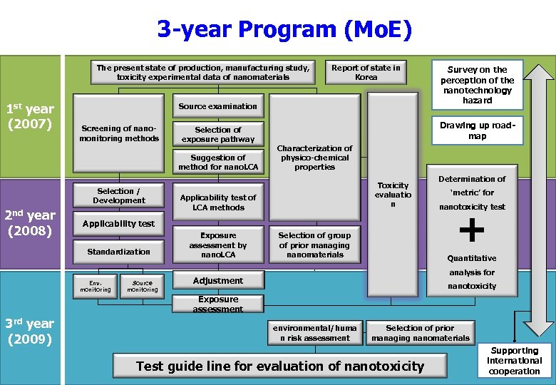 3 -year Program (Mo. E) The present state of production, manufacturing study, toxicity experimental data of nanomaterials 1 st year (2007) Source examination Screening of nanomonitoring methods Selection of exposure pathway Suggestion of method for nano. LCA Selection / Development 2 nd year (2008) Report of state in Korea Drawing up roadmap Characterization of physico-chemical properties Toxicity evaluatio n Applicability test of LCA methods Applicability test Standardization Env. monitoring Source monitoring Exposure assessment by nano. LCA Survey on the perception of the nanotechnology hazard Selection of group of prior managing nanomaterials Determination of ‘metric’ for nanotoxicity test + Quantitative analysis for Adjustment nanotoxicity Exposure assessment 3 rd year (2009) environmental/huma n risk assessment Selection of prior managing nanomaterials Test guide line for evaluation of nanotoxicity Supporting international cooperation