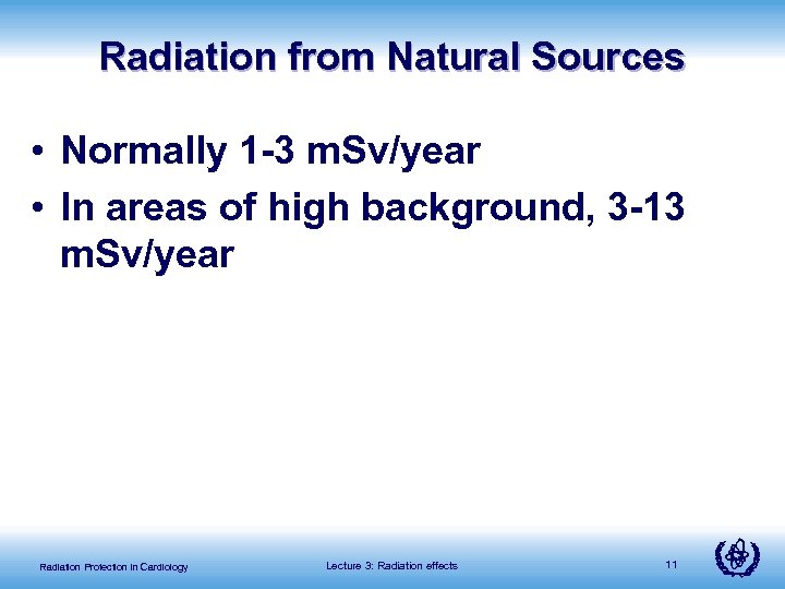 Radiation from Natural Sources • Normally 1 -3 m. Sv/year • In areas of high background, 3 -13 m. Sv/year Radiation Protection in Cardiology Lecture 3: Radiation effects 11