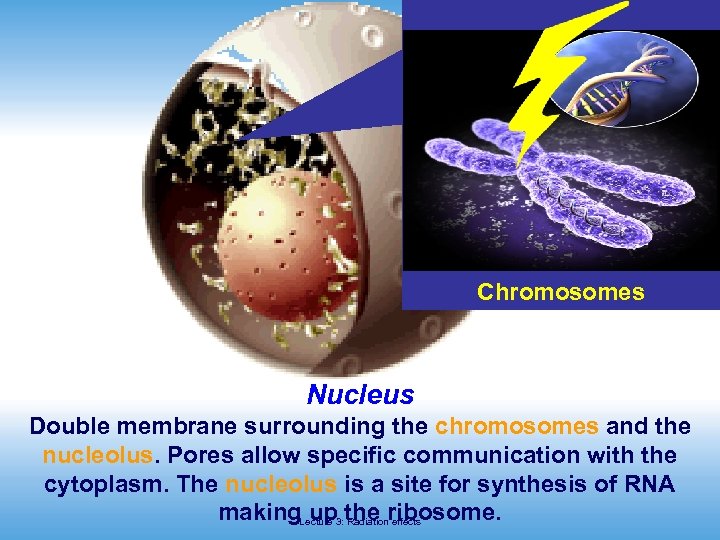 International Atomic Energy Agency Chromosomes Nucleus Double membrane surrounding the chromosomes and the nucleolus. Pores allow specific communication with the cytoplasm. The nucleolus is a site for synthesis of RNA making. Lecture 3: the ribosome. up Radiation effects