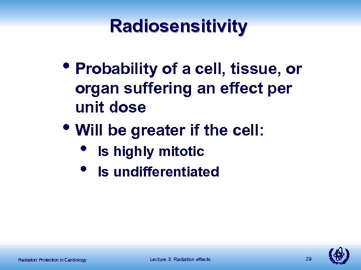 Radiosensitivity • Probability of a cell, tissue, or • organ suffering an effect per unit dose Will be greater if the cell: • • Radiation Protection in Cardiology Is highly mitotic Is undifferentiated Lecture 3: Radiation effects 29