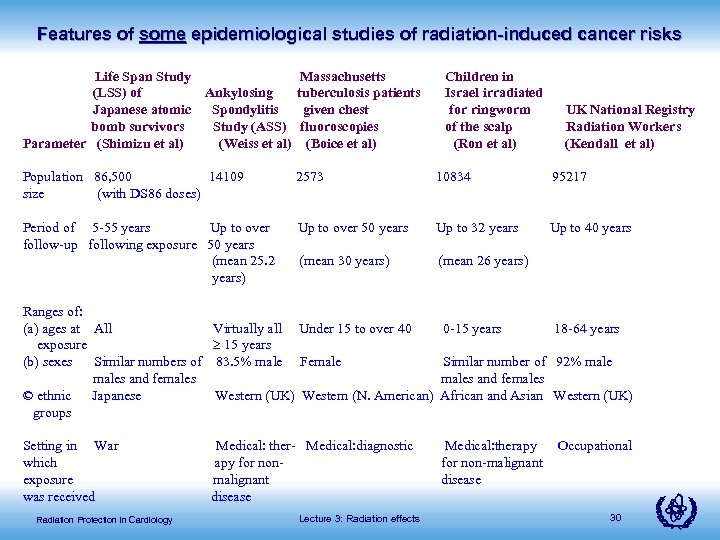 Features of some epidemiological studies of radiation-induced cancer risks Life Span Study (LSS) of Japanese atomic bomb survivors Parameter (Shimizu et al) Massachusetts Ankylosing tuberculosis patients Spondylitis given chest Study (ASS) fluoroscopies (Weiss et al) (Boice et al) Children in Israel irradiated for ringworm of the scalp (Ron et al) UK National Registry Radiation Workers (Kendall et al) Population 86, 500 14109 size (with DS 86 doses) 2573 10834 95217 Period of 5 -55 years Up to over follow-up following exposure 50 years (mean 25. 2 years) Up to over 50 years Up to 32 years Up to 40 years (mean 30 years) (mean 26 years) Ranges of: (a) ages at All exposure (b) sexes Similar numbers of males and females © ethnic Japanese groups Setting in War which exposure was received Radiation Protection in Cardiology Virtually all 15 years 83. 5% male Under 15 to over 40 0 -15 years 18 -64 years Female Similar number of 92% males and females Western (UK) Western (N. American) African and Asian Western (UK) Medical: ther- Medical: diagnostic apy for nonmalignant disease Lecture 3: Radiation effects Medical: therapy for non-malignant disease Occupational 30