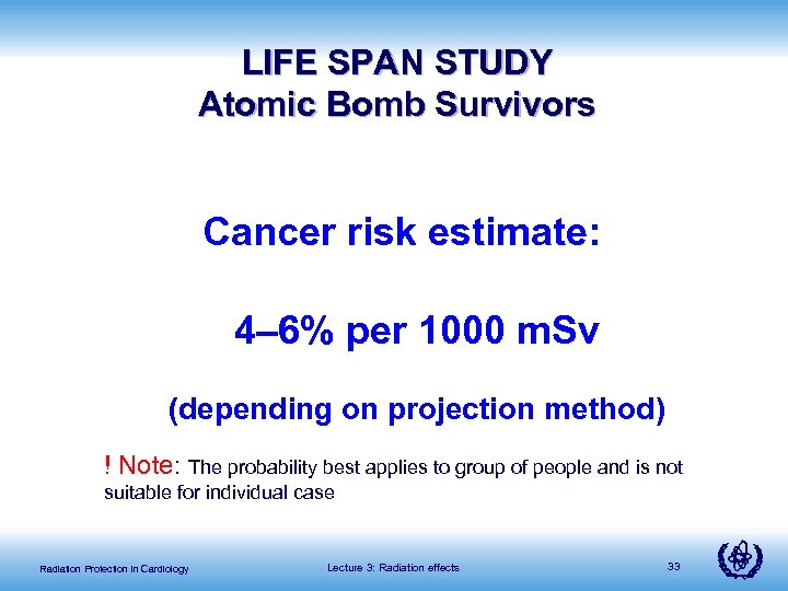 LIFE SPAN STUDY Atomic Bomb Survivors Cancer risk estimate: 4– 6% per 1000 m. Sv (depending on projection method) ! Note: The probability best applies to group of people and is not suitable for individual case Radiation Protection in Cardiology Lecture 3: Radiation effects 33