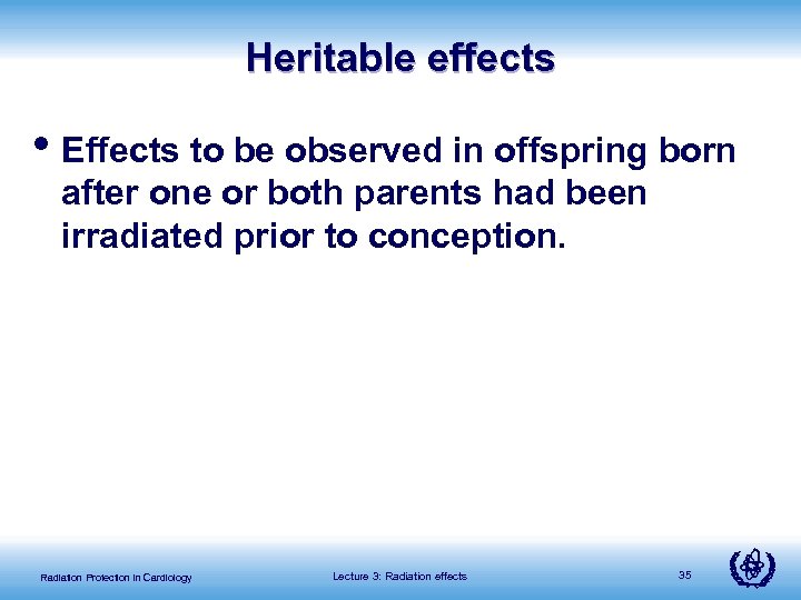Heritable effects • Effects to be observed in offspring born after one or both parents had been irradiated prior to conception. Radiation Protection in Cardiology Lecture 3: Radiation effects 35