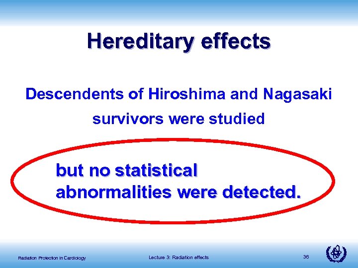Hereditary effects Descendents of Hiroshima and Nagasaki survivors were studied but no statistical abnormalities were detected. Radiation Protection in Cardiology Lecture 3: Radiation effects 36
