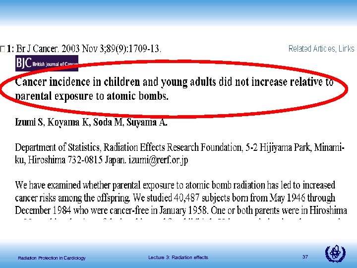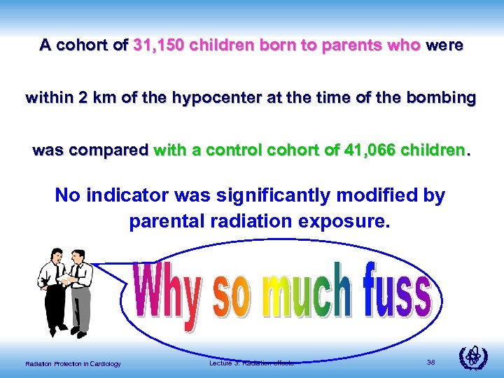 A cohort of 31, 150 children born to parents who were within 2 km of the hypocenter at the time of the bombing was compared with a control cohort of 41, 066 children. No indicator was significantly modified by parental radiation exposure. Radiation Protection in Cardiology Lecture 3: Radiation effects 38