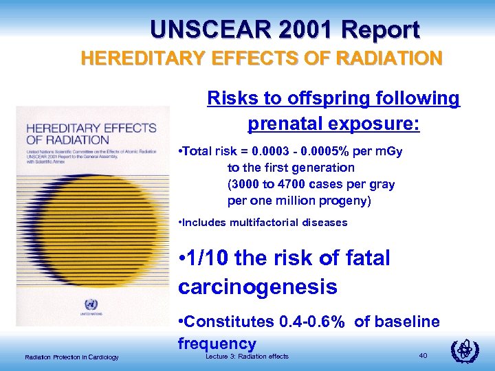 UNSCEAR 2001 Report HEREDITARY EFFECTS OF RADIATION Risks to offspring following prenatal exposure: • Total risk = 0. 0003 - 0. 0005% per m. Gy to the first generation (3000 to 4700 cases per gray per one million progeny) • Includes multifactorial diseases • 1/10 the risk of fatal carcinogenesis • Constitutes 0. 4 -0. 6% of baseline frequency Radiation Protection in Cardiology Lecture 3: Radiation effects 40