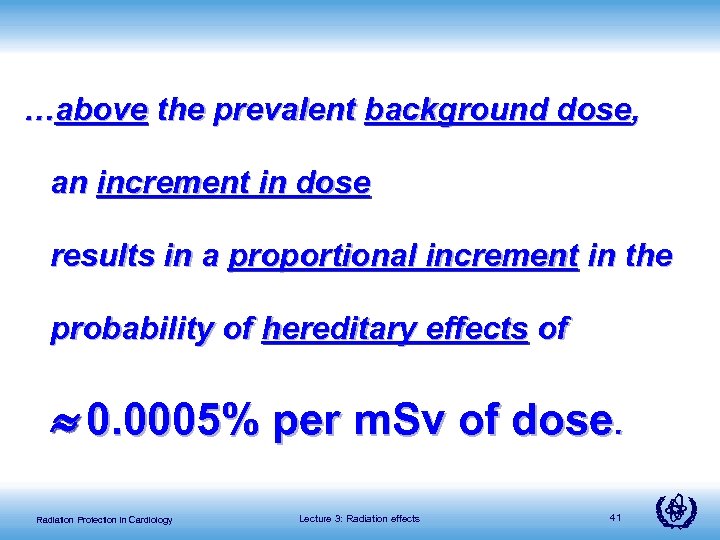 …above the prevalent background dose, an increment in dose results in a proportional increment in the probability of hereditary effects of 0. 0005% per m. Sv of dose. Radiation Protection in Cardiology Lecture 3: Radiation effects 41