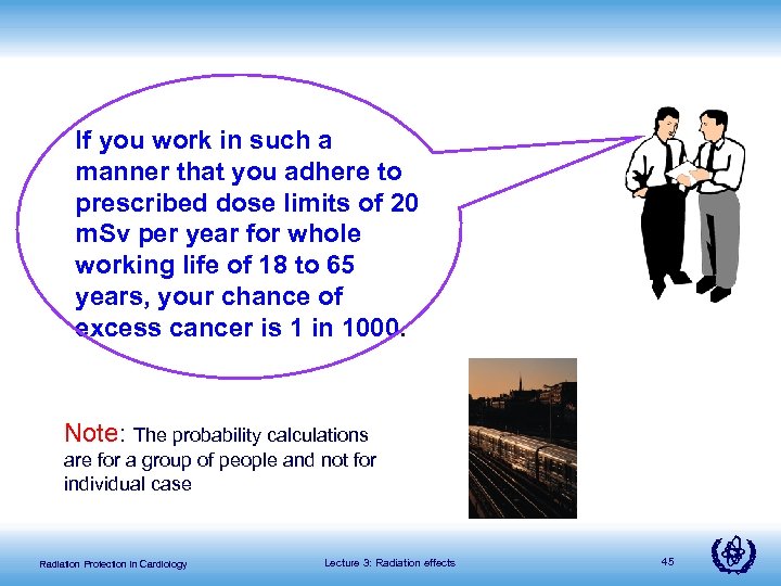 If you work in such a manner that you adhere to prescribed dose limits of 20 m. Sv per year for whole working life of 18 to 65 years, your chance of excess cancer is 1 in 1000. Note: The probability calculations are for a group of people and not for individual case Radiation Protection in Cardiology Lecture 3: Radiation effects 45