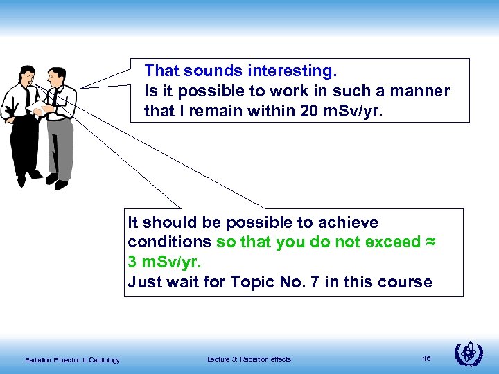 That sounds interesting. Is it possible to work in such a manner that I remain within 20 m. Sv/yr. It should be possible to achieve conditions so that you do not exceed ≈ 3 m. Sv/yr. Just wait for Topic No. 7 in this course Radiation Protection in Cardiology Lecture 3: Radiation effects 46