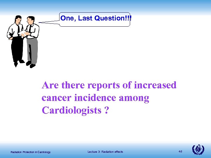 One, Last Question!!! Are there reports of increased cancer incidence among Cardiologists ? Radiation Protection in Cardiology Lecture 3: Radiation effects 48