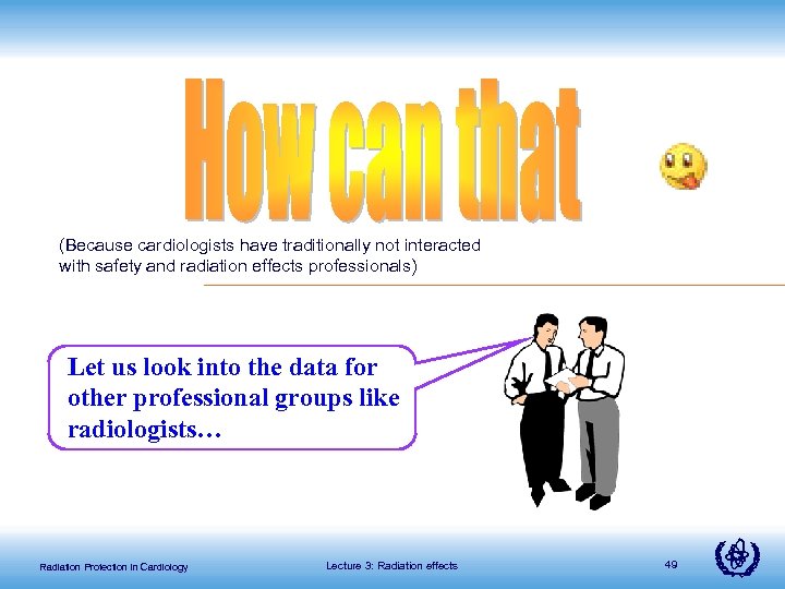 (Because cardiologists have traditionally not interacted with safety and radiation effects professionals) Let us look into the data for other professional groups like radiologists… Radiation Protection in Cardiology Lecture 3: Radiation effects 49