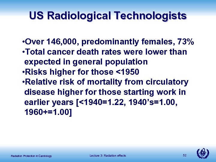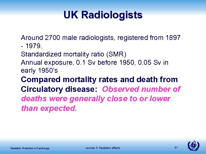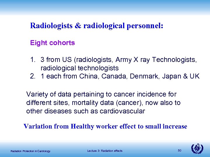 Radiologists & radiological personnel: Eight cohorts 1. 3 from US (radiologists, Army X ray Technologists, radiological technologists 2. 1 each from China, Canada, Denmark, Japan & UK Variety of data pertaining to cancer incidence for different sites, mortality data (cancer), now also to other diseases such as cardiovascular Variation from Healthy worker effect to small increase Radiation Protection in Cardiology Lecture 3: Radiation effects 50