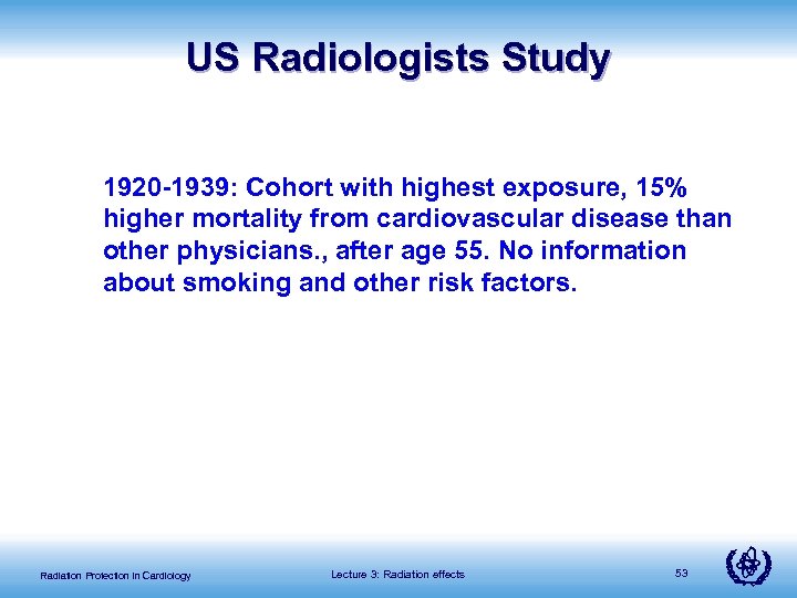 US Radiologists Study 1920 -1939: Cohort with highest exposure, 15% higher mortality from cardiovascular disease than other physicians. , after age 55. No information about smoking and other risk factors. Radiation Protection in Cardiology Lecture 3: Radiation effects 53