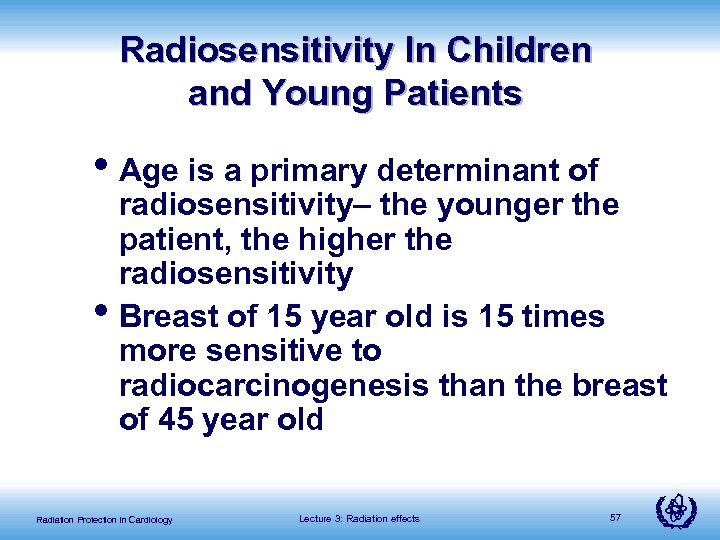Radiosensitivity In Children and Young Patients • Age is a primary determinant of • radiosensitivity– the younger the patient, the higher the radiosensitivity Breast of 15 year old is 15 times more sensitive to radiocarcinogenesis than the breast of 45 year old Radiation Protection in Cardiology Lecture 3: Radiation effects 57