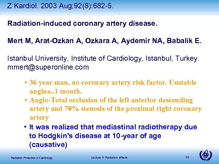 Z Kardiol. 2003 Aug; 92(8): 682 -5. Radiation-induced coronary artery disease. Mert M, Arat-Ozkan A, Ozkara A, Aydemir NA, Babalik E. Istanbul University, Institute of Cardiology, Istanbul, Turkey. mmert@superonline. com • 36 year man, no coronary artery risk factor. Unstable angina. . 1 month. • Angio-Total occlusion of the left anterior descending artery and 70% stenosis of the proximal right coronary artery • It was realized that mediastinal radiotherapy due to Hodgkin's disease at 10 -year of age (causative) Radiation Protection in Cardiology Lecture 3: Radiation effects 58
