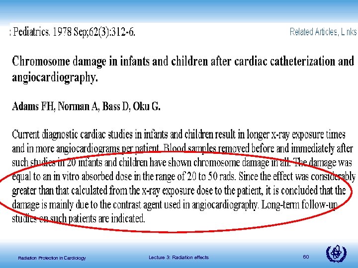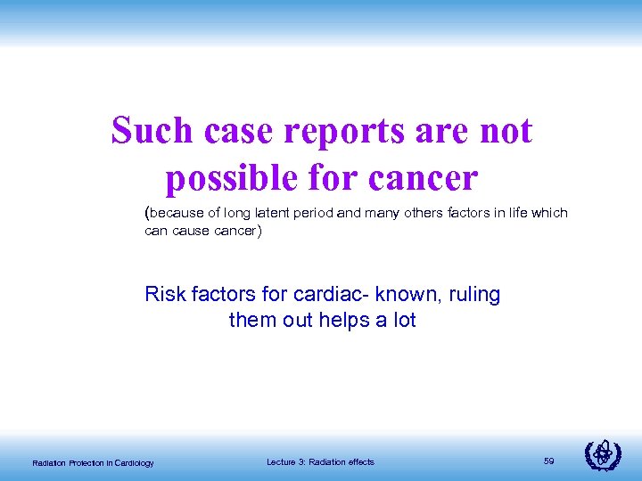 Such case reports are not possible for cancer (because of long latent period and many others factors in life which can cause cancer) Risk factors for cardiac- known, ruling them out helps a lot Radiation Protection in Cardiology Lecture 3: Radiation effects 59