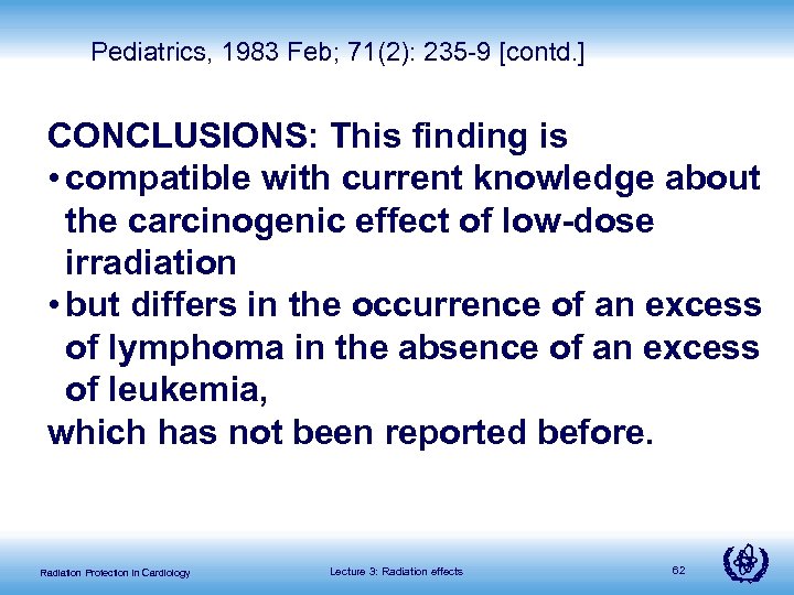 Pediatrics, 1983 Feb; 71(2): 235 -9 [contd. ] CONCLUSIONS: This finding is • compatible with current knowledge about the carcinogenic effect of low-dose irradiation • but differs in the occurrence of an excess of lymphoma in the absence of an excess of leukemia, which has not been reported before. Radiation Protection in Cardiology Lecture 3: Radiation effects 62