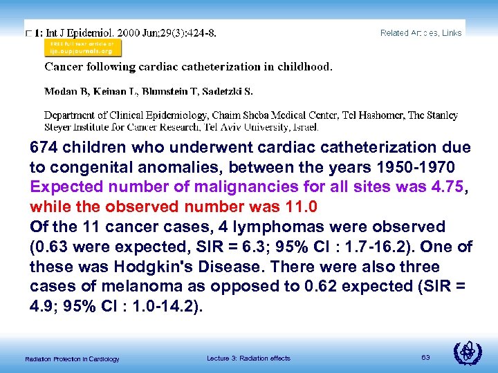 674 children who underwent cardiac catheterization due to congenital anomalies, between the years 1950 -1970 Expected number of malignancies for all sites was 4. 75, while the observed number was 11. 0 Of the 11 cancer cases, 4 lymphomas were observed (0. 63 were expected, SIR = 6. 3; 95% CI : 1. 7 -16. 2). One of these was Hodgkin's Disease. There were also three cases of melanoma as opposed to 0. 62 expected (SIR = 4. 9; 95% CI : 1. 0 -14. 2). Radiation Protection in Cardiology Lecture 3: Radiation effects 63