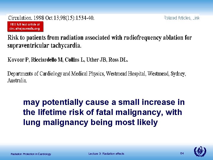 may potentially cause a small increase in the lifetime risk of fatal malignancy, with lung malignancy being most likely Radiation Protection in Cardiology Lecture 3: Radiation effects 64
