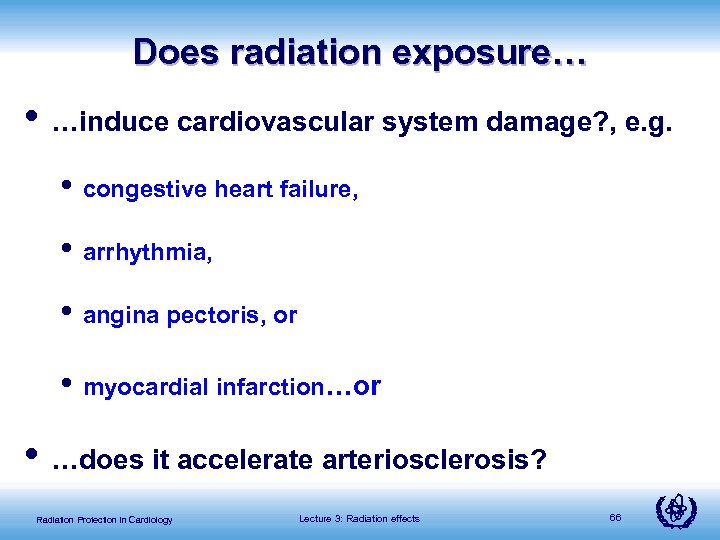 Does radiation exposure… • …induce cardiovascular system damage? , e. g. • congestive heart failure, • arrhythmia, • angina pectoris, or • myocardial infarction…or • …does it accelerate arteriosclerosis? Radiation Protection in Cardiology Lecture 3: Radiation effects 66